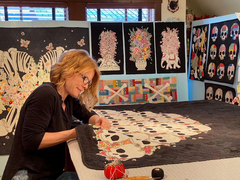 Maggy Rozycki Hiltner is a full-time studio artist and activist living in Red Lodge, Montana. She has a BFA from Syracuse University and was a Studio Assistant at Arrowmont School of Arts and Crafts. For over 20 years now, she has been collaging found embroidery and quilts with her hand-stitched imagery, giving these abandoned textiles new meaning and relevance. As a member of SAQA (Studio Art Quilt Associates), she has served as a Regional Representative for Montana and Idaho and is currently their Regional Exhibitions Coordinator. Her work has been published and exhibited in museums and galleries nationally and internationally, and she was a 2015 recipient of the Montana Arts Council Artist’s Innovation Award.
