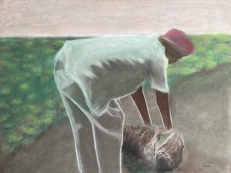 Gisele Annesi Pennock refers to her chosen medium, pastels, as “marvelous and messy”. For her, the act of smearing a handful of soft chalky pastel across a paper while color scatters on the artist and nearby furniture is a wonderfully physical and engaging way to make art. In some cases, she gives her pieces a more canvas-like texture by covering the final work with a heated laminate.